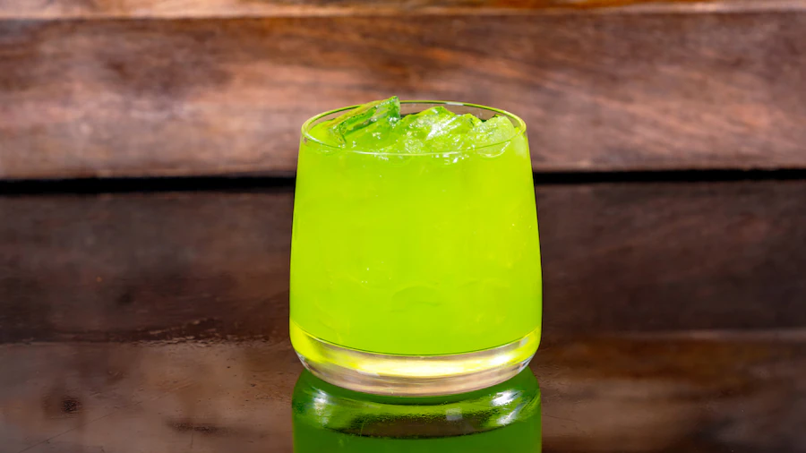 Minute Maid Lemonade, apple juice, and kiwi and Granny Smith apple syrups garnished with a purple orchid (Non-alcoholic beverage) - NEW